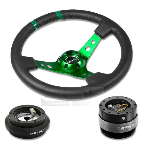 NRG-SRK-190H+016R-GN+200BK, NRG Innovations 13.78" 350mm 3" Deep Dish Style Black Leather Green Center Marking Green Spokes Racing Steering Wheel Combo with 6 Hole Short Hub Adapter with Gen 2.0 Black Quick Release Kit SRK-190H